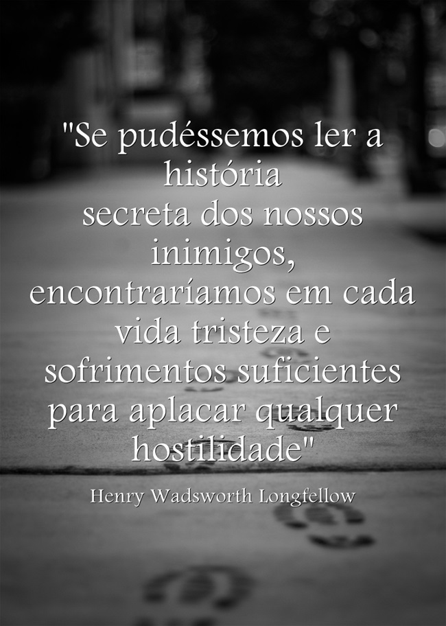 SE PUDÉSSEMOS LER A HISTÓRIA SECRETA DOS NOSSOS INIMIGOS, ENCONTRARÍAMOS EM CADA VIDA TRISTEZA E SOFRIMENTOS SUFICIENTES PARA APLACAR QUALQUER HOSTILIDADE - HENRY WADSWORTH LONGFELLOW