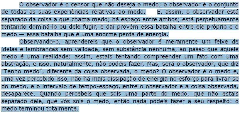Observando-o, aprendereis que o observador é meramente um feixe de idéias e lembranças sem validade, sem substância nenhuma, ao passo que aquele medo é uma realidade; assim, estais tentando compreender um fato com uma abstração, e isso, naturalmente, não podeis fazer. Mas, será o observador, que diz “Tenho medo”, diferente da coisa observada, o medo? O observador é o medo e, uma vez percebido isso, não há mais dissipação de energia no esforço para livrar-se do medo, e o intervalo de tempo-espaço, entre o observador e a coisa observada, desaparece. Quando percebeis que sois uma parte do medo, que não estais separado dele, que vós sois o medo, então nada podeis fazer a seu respeito: o medo terminou totalmente.