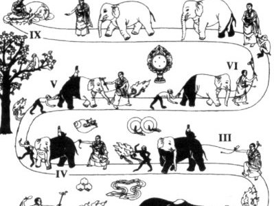 Esta ilustração é a reprodução de um desenho tibetano que representa nove cenas, os nove estágios do caminho da meditação estabilizadora ou shamatha.