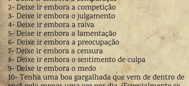 10 passos para ficar Zen 1- Deixe ir embora a comparação 2- Deixe ir embora a competição 3- Deixe ir embora o julgamento 4- Deixe ir embora a raiva 5- Deixe ir embora a lamentação 6- Deixe ir embora a preocupação 7- Deixe ir embora a censura 8- Deixe ir embora o sentimento de culpa … Continue lendo 10 passos para ficar Zen – 10 to Zen