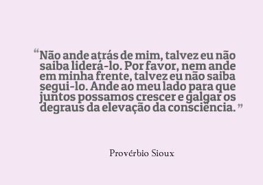 Não ande atrás de mim, talvez eu não saiba liderá-lo. Por favor, nem ande em minha frente, talvez eu não saiba segui-lo. Ande ao meu lado para que juntos possamos crescer e galgar os degraus da elevação da consciência. Provérbio Sioux